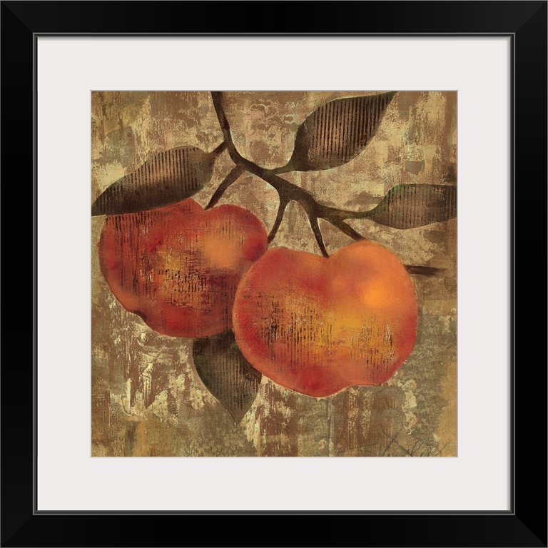 <p>Painting of two pieces of fruit hanging from a branch with textured abstract background.</p>