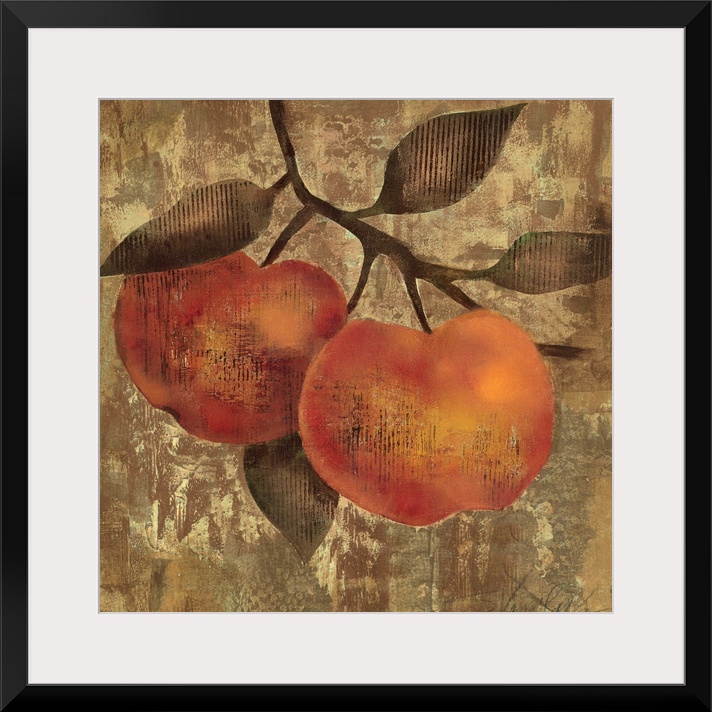 <p>Painting of two pieces of fruit hanging from a branch with textured abstract background.</p>