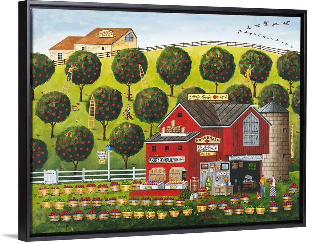 <p>Americana scene of a barn selling apple goods in front of an orchard.</p>
