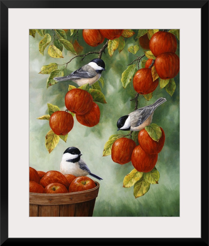 <p>Three little chickadees perched on apples in an apple tree and basket.</p>