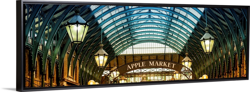 <p>Panoramic image of the arches and hanging lamps in Covent Garden Market.</p>