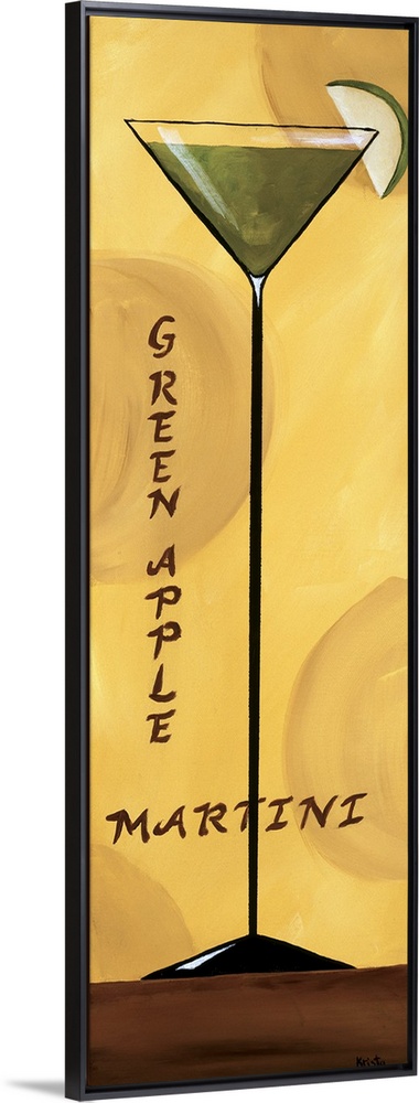 <p>A long vertical design of a tall stemmed drinking glass of a green apple martini against a yellow backdrop.</p>