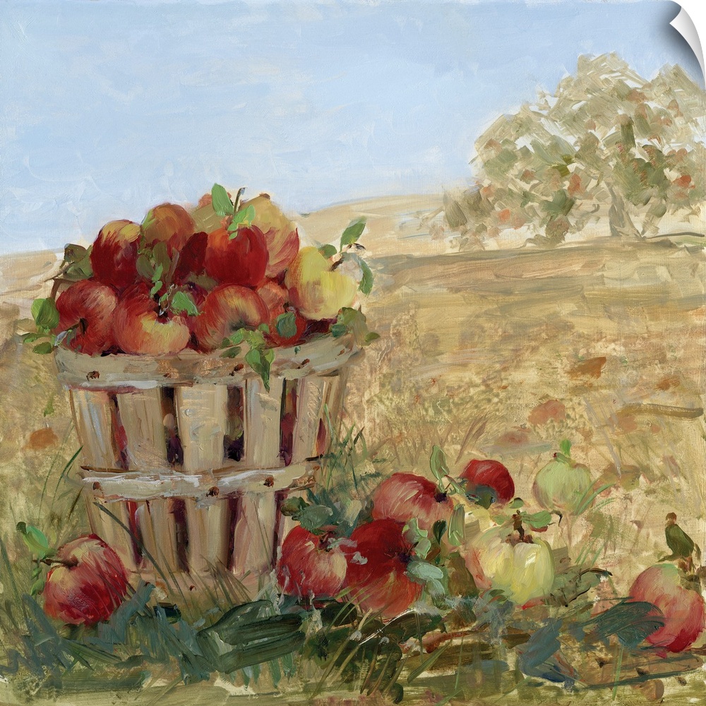 <p>Square painting of baskets of apples that have been freshly picked with an Autumn landscape in the background.</p>