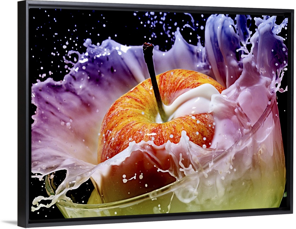 <p>An apple splashing into a glass of milk in pastel colors.</p>