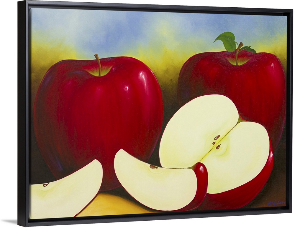<p>Luscious red apples sit before a background of dappled blue. Realistically depicted, freshly cut wedges tempt the viewer with their beauty. Mariana Gonzalez creates this tantalizing painting in radiant oils. Titled Manzanas in Spanish.</p>