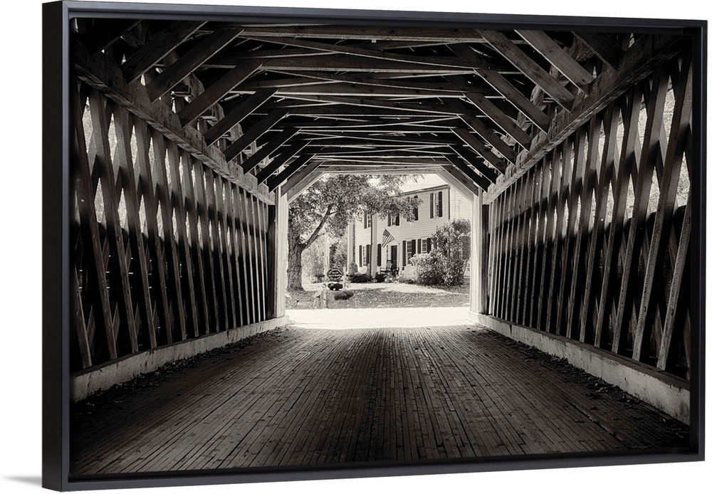 <p>Fine art photo of the inside of a wooden covered bridge, in black and white.</p>
