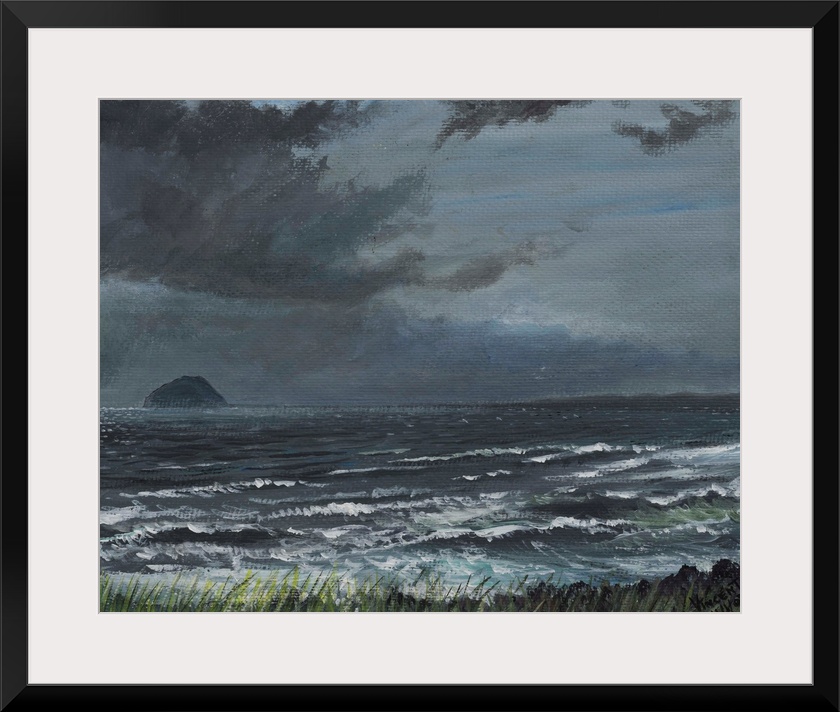 <p>Contemporary painting of an idyllic seascape under stormy clouds.</p>