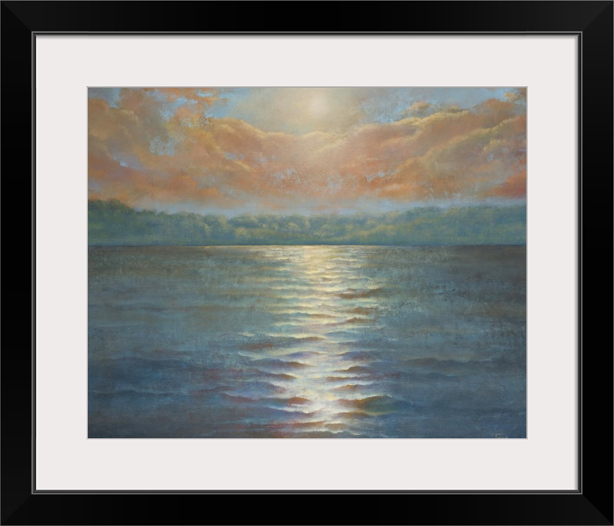 <p>Contemporary painting of a sun setting over a body of water.</p>