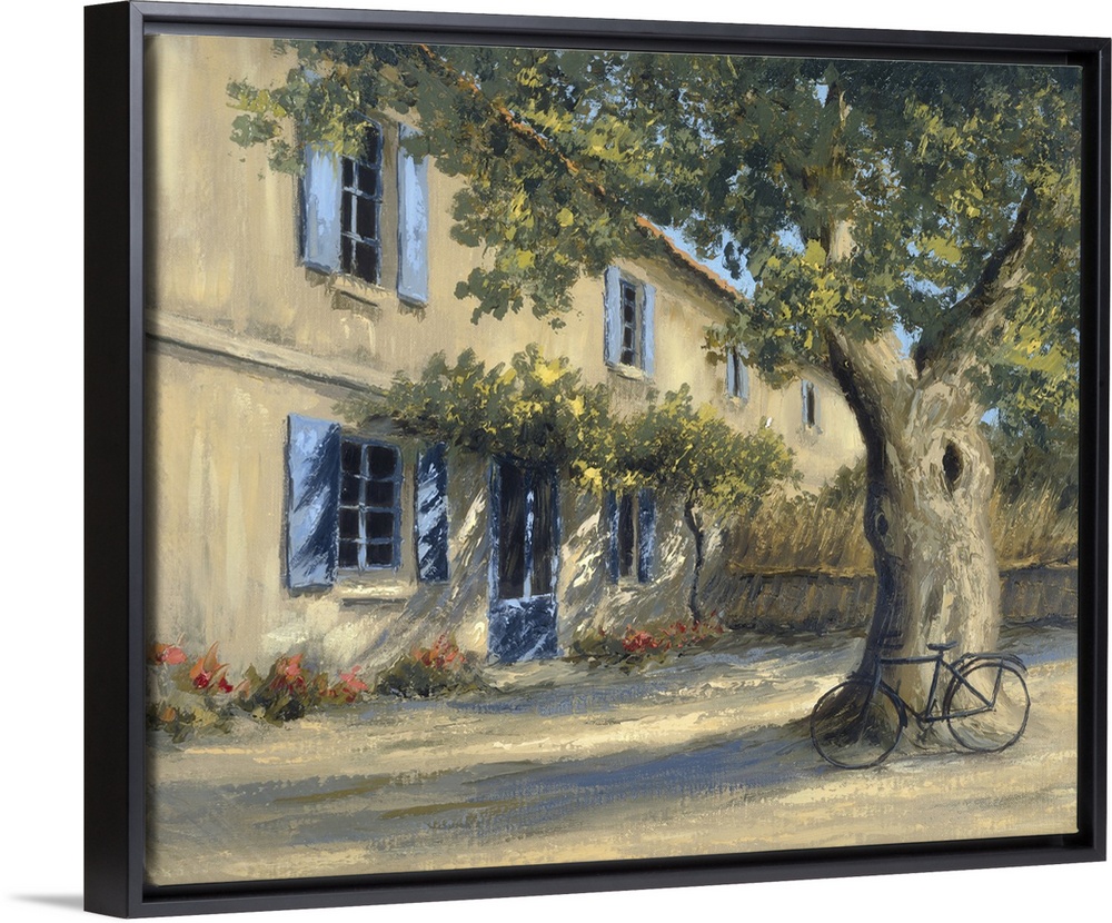 <p>A European country home with a large tree in the front yard with a bicycle.</p>