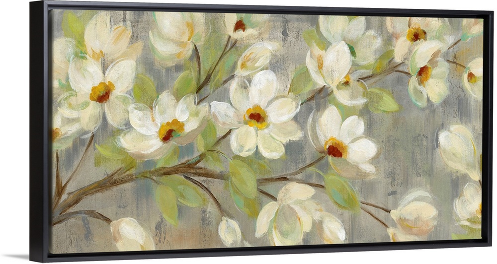 <p>Contemporary painting of magnolia flowers against a pale green background.</p>