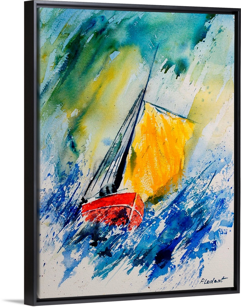 <p>A watercolor painting done in primary colors of a sailboat during rough winds.</p>