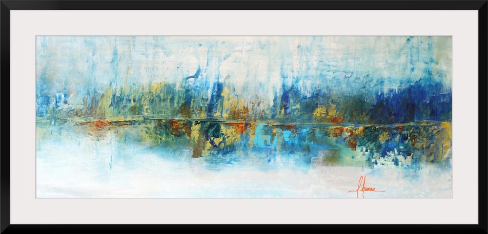 <p>Abstract seascape painting in tropical blue and gold shades.</p>