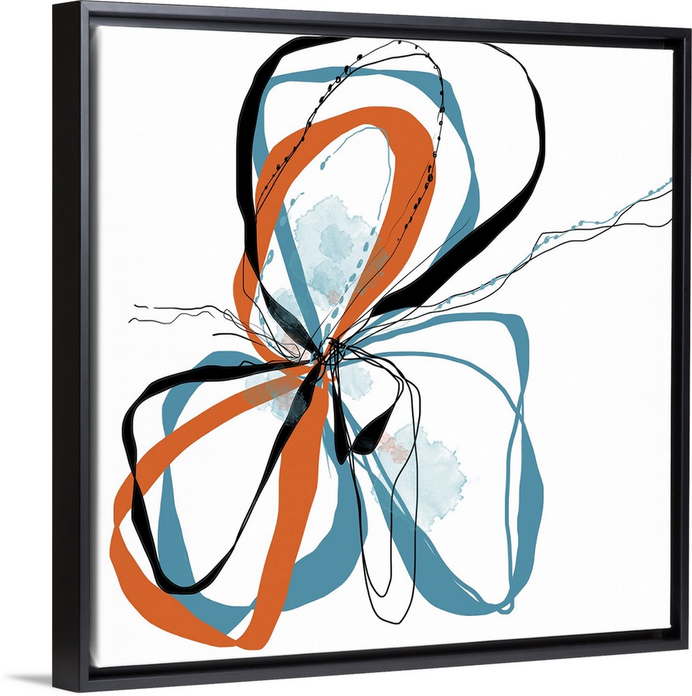 <p>a bright floral with flowing lines of intertwined colors like aqua, tangerine and black.</p>