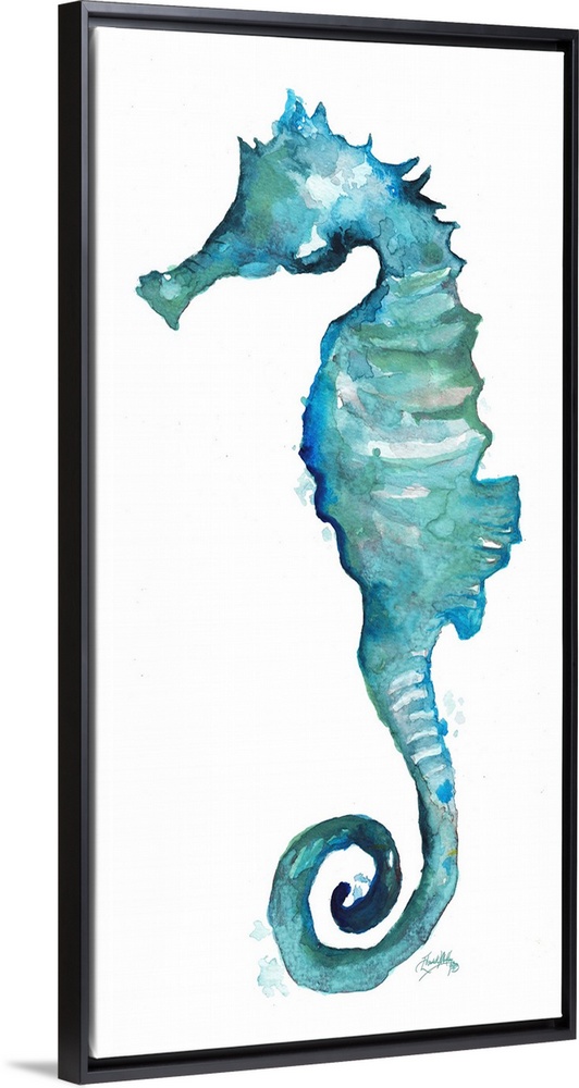 <p>A watercolor painting of an aqua colored seahorse.</p>