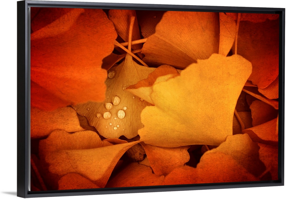 <p>Artistic photo of fallen ginkgo leaves in autumn with small dew drops.</p>