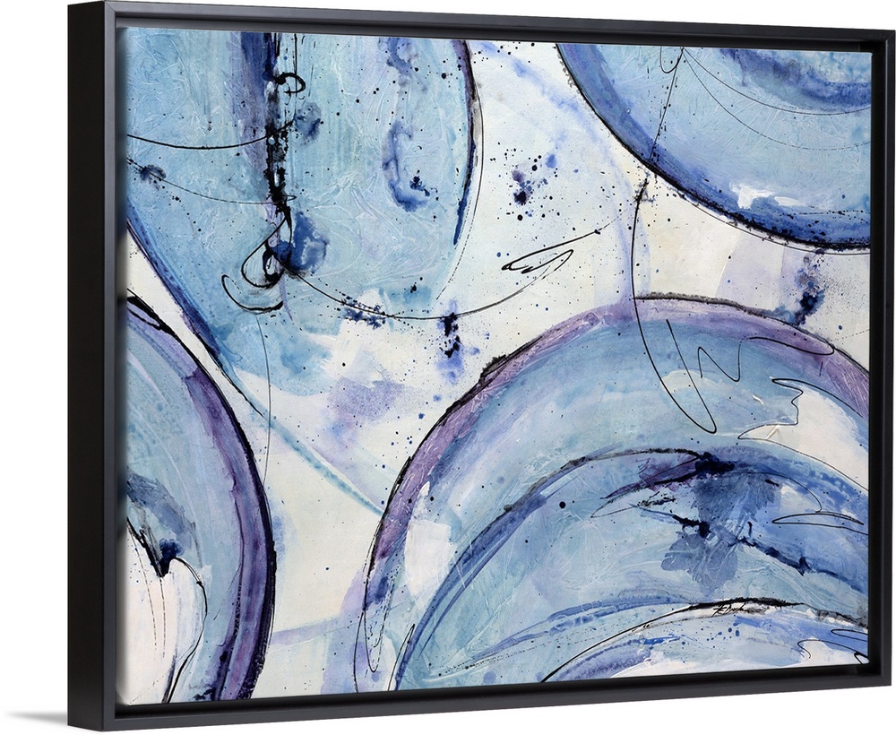<p>Landscape, abstract artwork on a big canvas of circular shapes with rough edges in cool tones, with dark, thin scribbles and spatters throughout the image.</p>