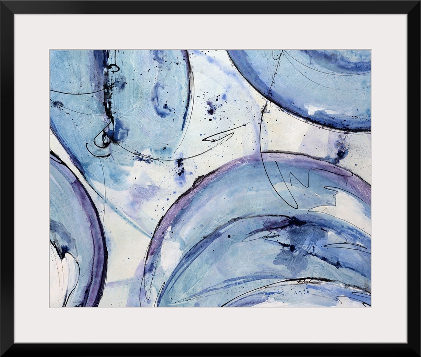 <p>Landscape, abstract artwork on a big canvas of circular shapes with rough edges in cool tones, with dark, thin scribbles and spatters throughout the image.</p>