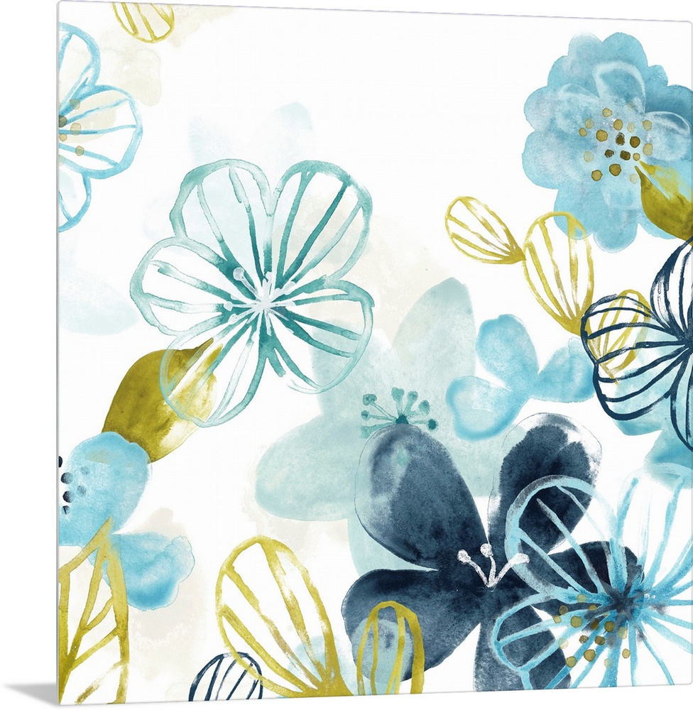 <p>Watercolor painting of delicate blue and gold flowers.</p>