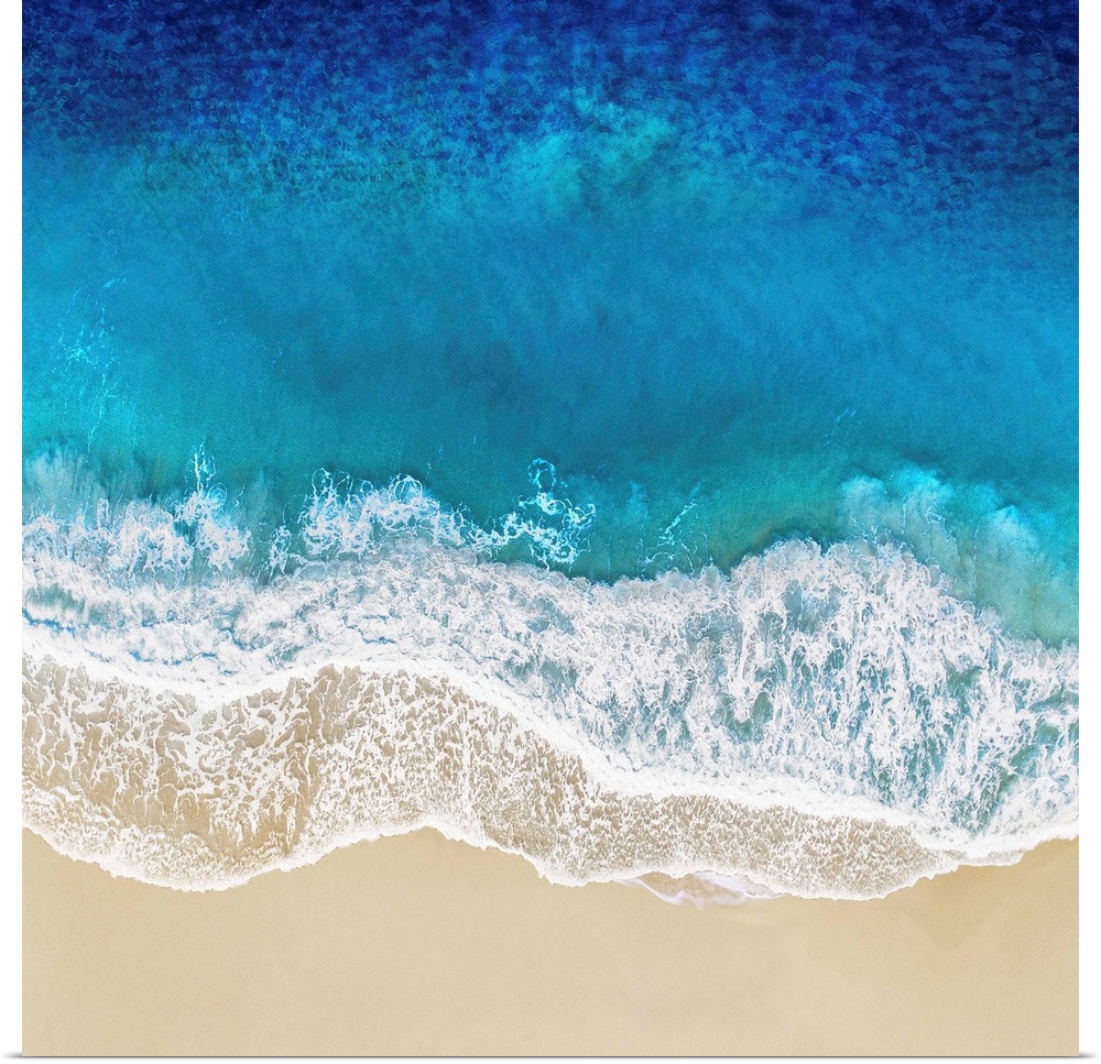 <p>One artwork in a series of aerial shots of a beach as blue waves break upon the shore.</p>