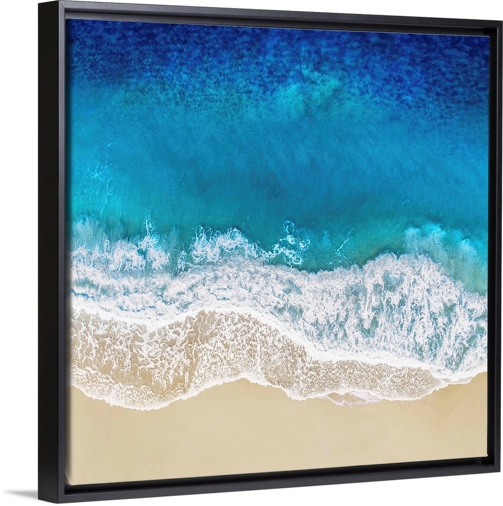 <p>One artwork in a series of aerial shots of a beach as blue waves break upon the shore.</p>
