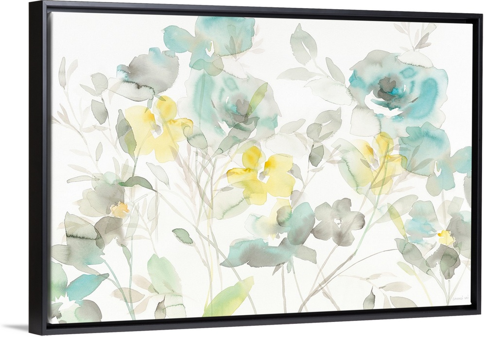 <p>Soft watercolor painting of blue, yellow, and gray flowers on a white background.</p>