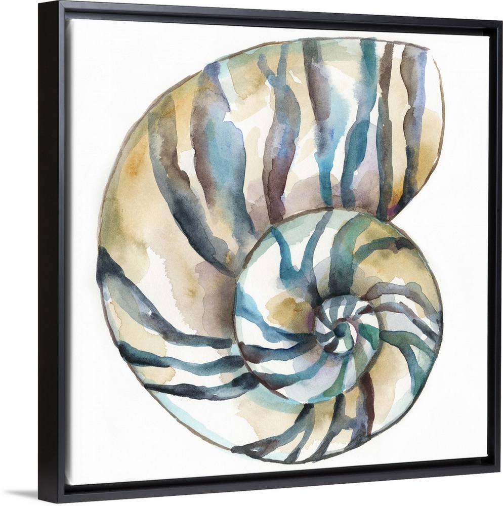 <p>Detailed watercolor painting of a striped spiral seashell.</p>