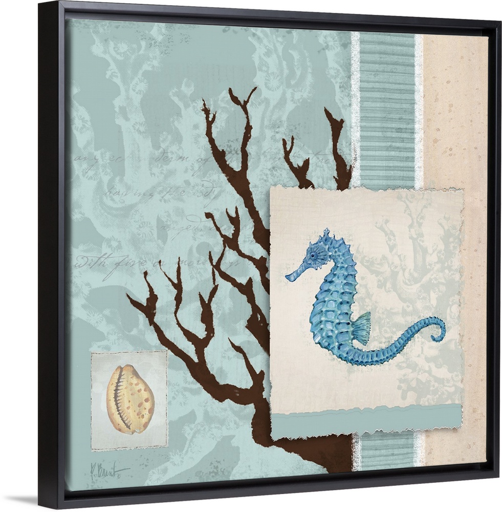 <p>Decorative panel made of nautical-themed elements, including a coral silhouette, a small shell, and a seahorse.</p>