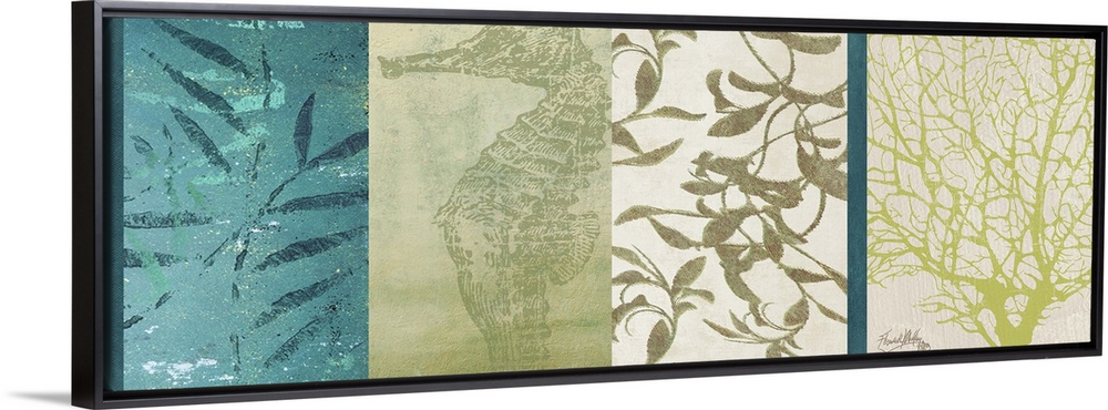 <p>Docor perfect for the home of a panoramic piece that has four different designs running across it from leaves to a sea horse all in cooler tones.</p>