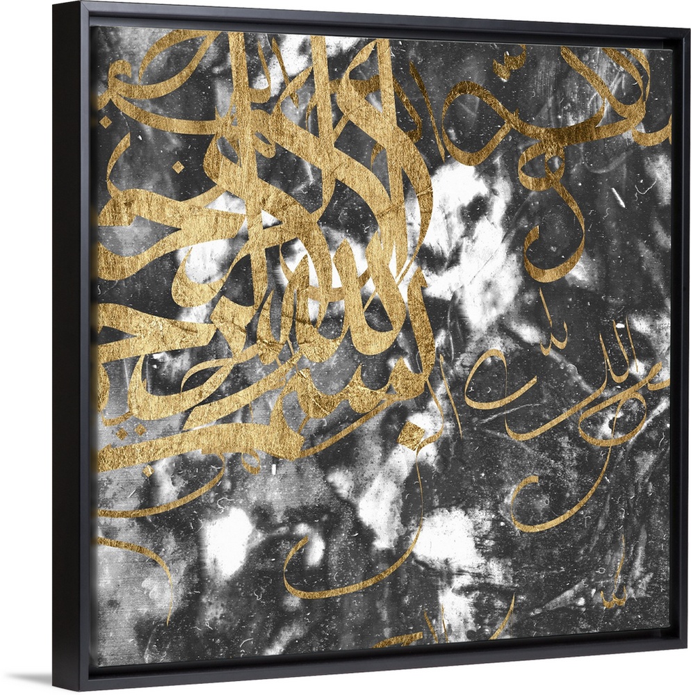 <p>Contemporary abstract painting of Arabic calligraphy in gold against an abstract black and white background.</p>