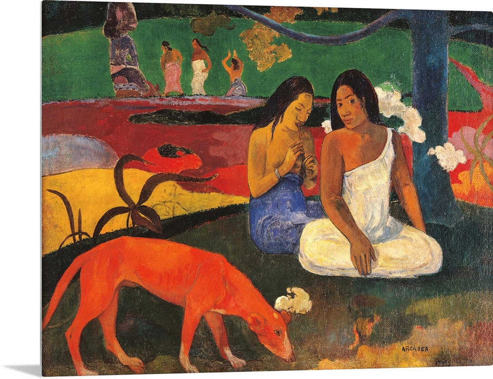 <p>Arara (Jokes), by Paul Gauguin, 1892, 19th Century, oil on canvas, cm 73 x 94 - France, Ile de France, Paris, Muse dOrsay. All. Women yellow orange dog tree trunk green red dress white blue. (251221) Everett Collection\Mondadori Portfolio</p>