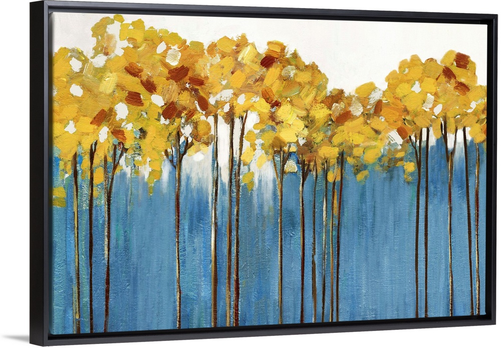 <p>Contemporary painting of a row of slender trees with amber leaves over periwinkle blue.</p>
