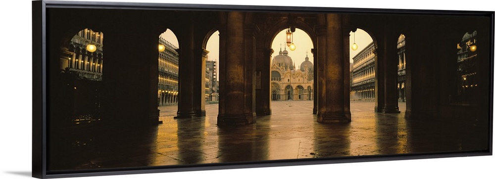 <p>Panoramic photograph taken of St. Marks Square in Venice looking through stone arches and into the square.</p>