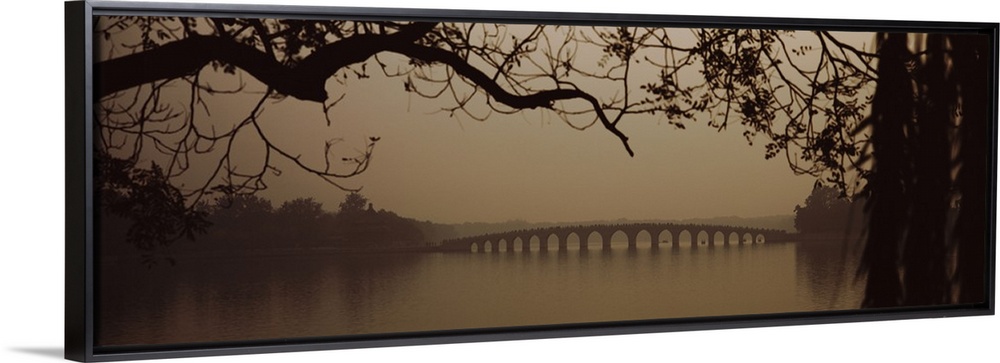 <p>Panoramic photograph of overpass crossing water with large tree branch silhouette in the foreground at dusk.</p>