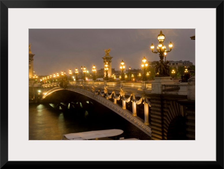 <p>Big photo on canvas of a bridge lit up going over a river in France.</p>