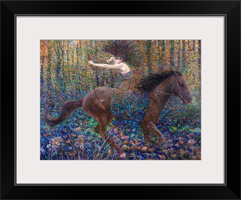 <p>Brightly colored contemporary artwork of a man riding a horse and shooting a bow.</p>