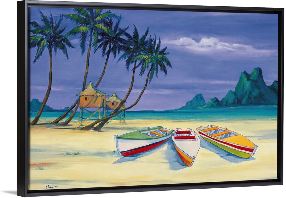 <p>Contemporary painting of boats and beach huts on a beach with several palm trees.</p>