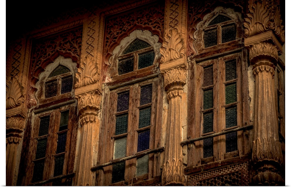 <p>Photograph of stained glass windows with intricately detailed pillars in-between each.</p>