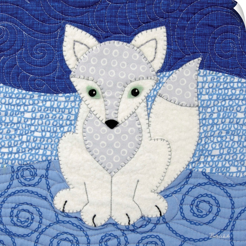 <p>Square sewn art with a white arctic fox and a blue patterned background.</p>