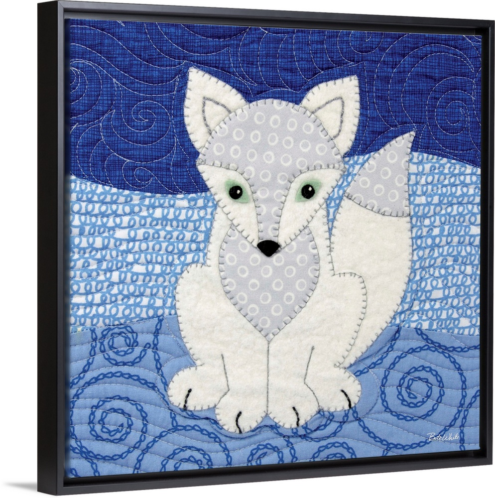 <p>Square sewn art with a white arctic fox and a blue patterned background.</p>