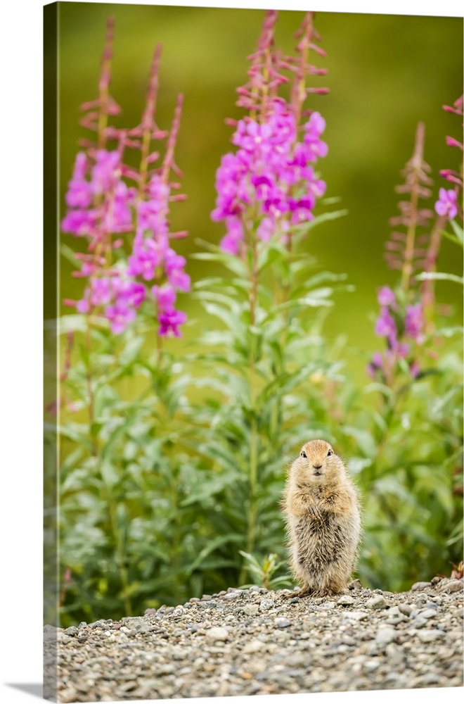 <p>An Arctic Ground Squirrel (Urocitellus parryii) looks at camera while feeding in late summer. Fireweed (Chamaenerion angustifolium) is in bloom in the Hatcher Pass area near Palmer, South-Central Alaska; Alaska, United States of America</p>