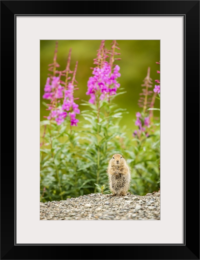 <p>An Arctic Ground Squirrel (Urocitellus parryii) looks at camera while feeding in late summer. Fireweed (Chamaenerion angustifolium) is in bloom in the Hatcher Pass area near Palmer, South-Central Alaska; Alaska, United States of America</p>