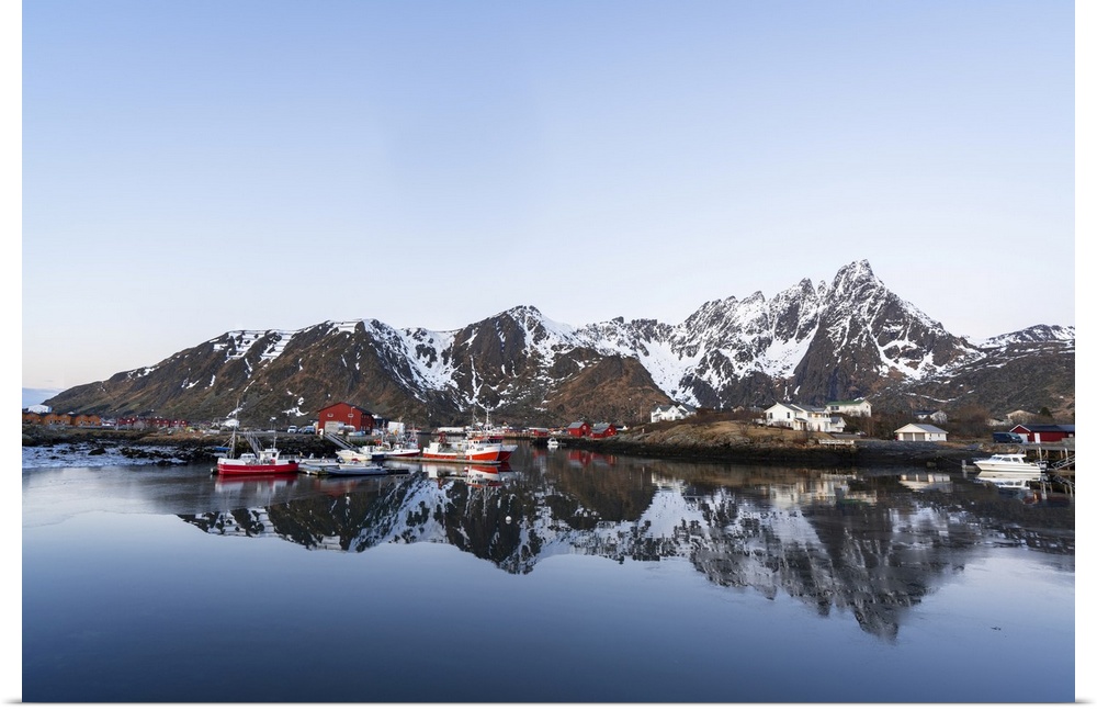 <p>Calm water reflecting the Arctic landscape of the traditional fishing marina of Ballstad at dawn, Vestvagoy, Lofoten Islands, Norway, Scandinavia, Europe</p>