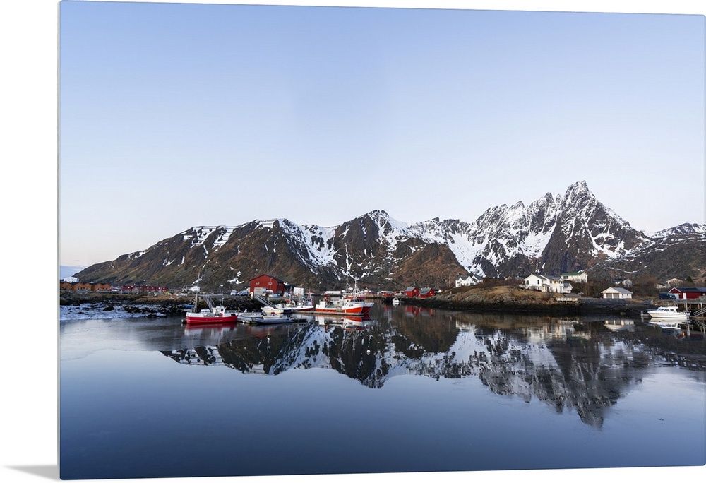 <p>Calm water reflecting the Arctic landscape of the traditional fishing marina of Ballstad at dawn, Vestvagoy, Lofoten Islands, Norway, Scandinavia, Europe</p>