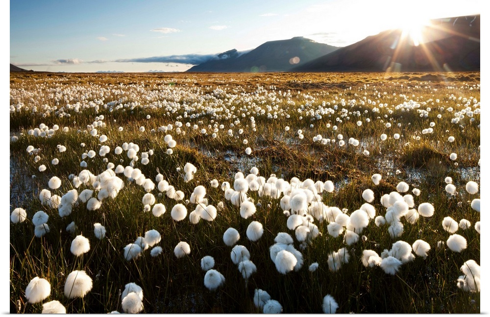 <p>Norway, Svalbard, Midnight sun lights meadow of white Cottongrass (Eriophorum Scheuczeri) in mountain valley north of Longyearbyen. Photograph by Paul Souders.</p>