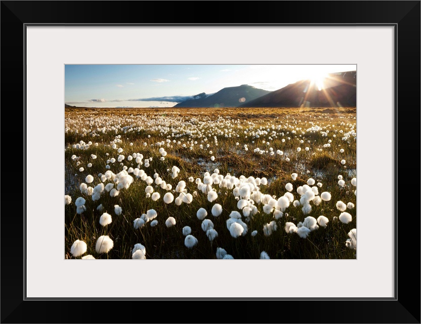 <p>Norway, Svalbard, Midnight sun lights meadow of white Cottongrass (Eriophorum Scheuczeri) in mountain valley north of Longyearbyen. Photograph by Paul Souders.</p>