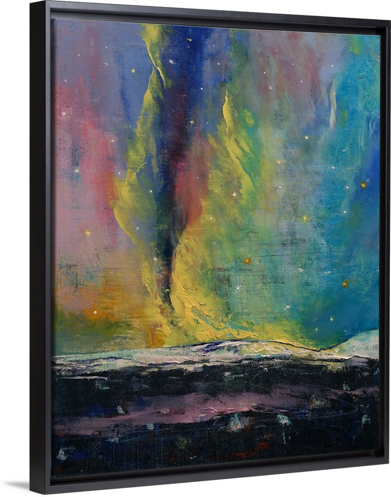 <p>A contemporary painting of the northern lights above snowy landscape.</p>