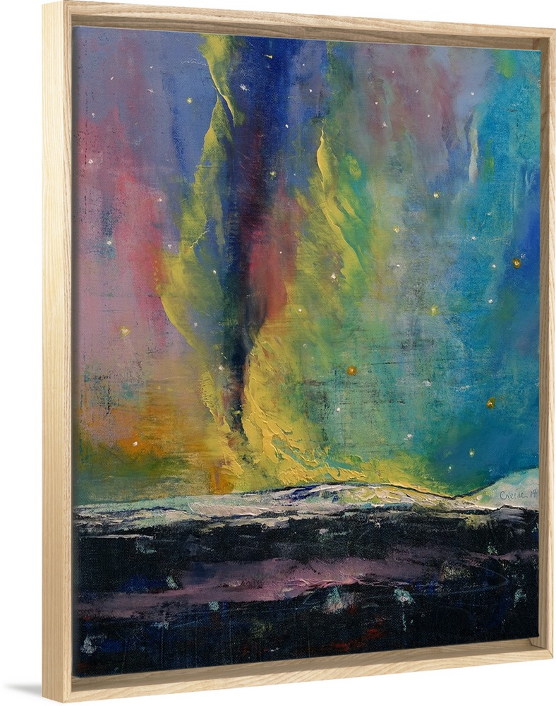 <p>A contemporary painting of the northern lights above snowy landscape.</p>