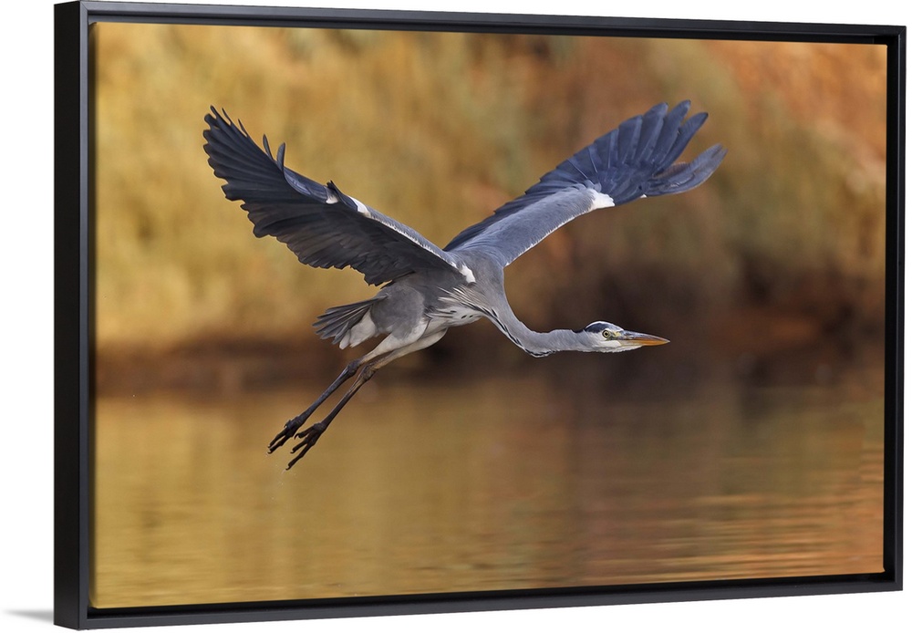 <p>A Great Blue Heron flies low over the water, with wings and neck outstretched.</p>