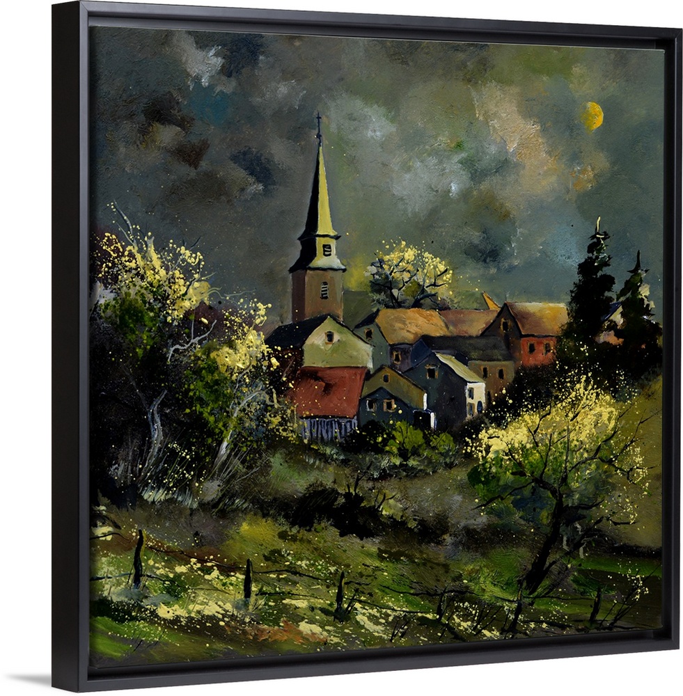 <p>Square painting of a darkened landscape with a field in the foreground and a Belgium village in the background with cloudy sky in the distance.</p>