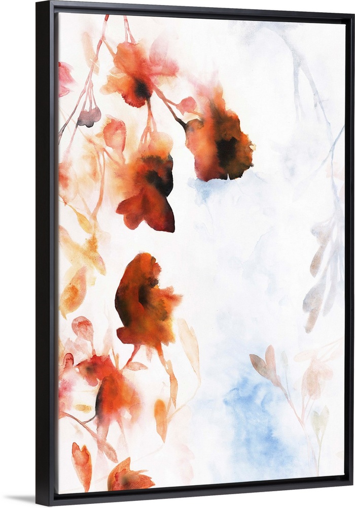 <p>Silhouettes of orange toned flowers lining the left side of the canvas on a white background with faint colors underneath resembling leaves and branches.</p>